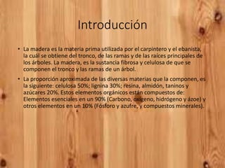 La madera se obtiene del tronco y ramas de los árboles. Se clasifica según su dureza y si es frondosa o resinosa. Tiene propiedades físicas como la dureza, flexibilidad e higroscopicidad, y mecánicas como la compresión, flexión y resistencia al choque. Se usa para fabricar muebles, casas, barcos y papel, entre otros usos. En la construcción, proporciona beneficios como confort acústico, aislamiento térmico y crea un ambiente relajante