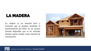 El documento describe las propiedades y usos de la madera. La madera se produce a través de la transformación de árboles y se compone principalmente de hidrógeno, oxígeno, carbono y nitrógeno. Se utiliza comúnmente en la construcción debido a su resistencia y ligereza. Existen varios sistemas constructivos de madera como el sistema de plataforma, paneles SIP y postes y vigas.