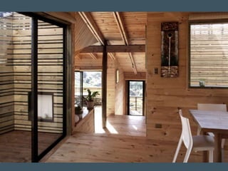 Este documento describe los diferentes usos de la madera en la construcción, incluyendo revestimientos, carpintería, techos, pisos, escaleras y estructuras. También discute los desafíos asociados con la madera como material de construcción y cómo la tecnología ha ayudado a superar problemas como la retracción, la biodegradación, la intemperie y la combustibilidad. Además, destaca ejemplos históricos y contemporáneos que demuestran que es posible construir integralmente en madera.
