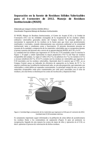 El documento resume la cantidad y composición de los residuos sólidos recuperados en el primer semestre de 2012 a través del programa de manejo de residuos institucionales de un campus universitario. Se recuperaron 27.93 toneladas de residuos, siendo el papel el material mayoritario (75%). El programa logró una eficiencia de separación de residuos del 93%. La mayoría de los materiales recuperados son exportados para su reciclaje.
