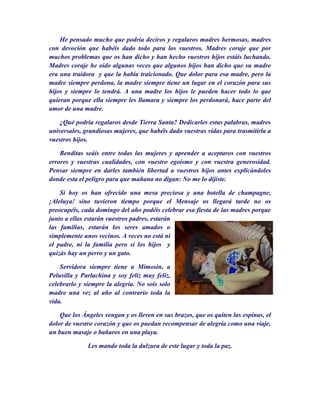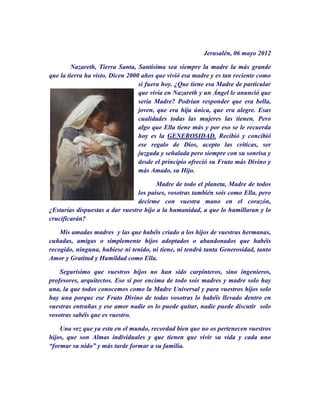 Este documento es una carta que celebra a la Virgen María y a todas las madres. Resalta la generosidad, humildad y amor incondicional de la Virgen al aceptar ser la madre de Jesús a pesar de las dificultades. También honra a todas las madres por los sacrificios que hacen por sus hijos y les desea un feliz día de las madres.