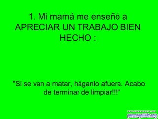 El documento resume las lecciones que una persona aprendió de su madre a través de varias frases y citas. La madre enseñó sobre apreciar el trabajo bien hecho, religión, lógica, predicciones, ironía, ahorro, osmosis, contorsionismo, fuerza de voluntad, meteorología, paradojas, modificación de patrones de comportamiento, envidia y matemáticas, ventriloquía, odontología y rectitud.