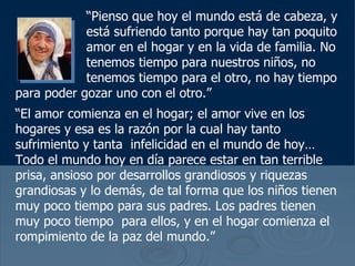 Madre Teresa reflexiona sobre la importancia del amor en el hogar y entre las personas para contrarrestar el sufrimiento en el mundo. Ella ve a Dios en cada persona y dedica su vida a servir a los más pobres, no solo con comida y refugio sino también con amor y dignidad. Su trabajo se enfoca en pequeñas acciones de amor y compasión más que en logros materiales.