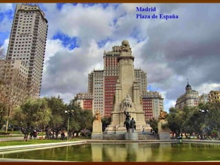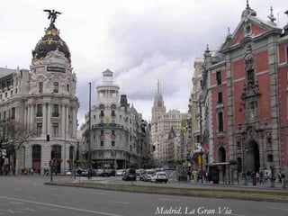 El documento resume brevemente la historia y algunos datos sobre Madrid, la capital de España. Explica que Madrid tiene más de 3 millones de habitantes y es la ciudad más grande de España y la tercera de la Unión Europea. También menciona que el rey Felipe II eligió Madrid como sede de la corte en 1561, convirtiéndola desde entonces en la residencia del gobierno y la capital de España. Finalmente, presenta algunos de los lugares más importantes para visitar en Madrid.