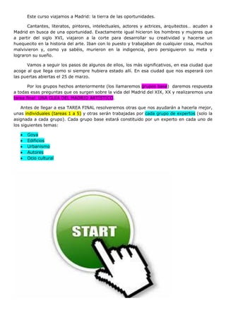 Este documento describe un curso sobre Madrid que incluye varias tareas individuales y grupales. Los estudiantes se dividirán en grupos base con expertos en temas como Goya, edificios, urbanismo y autores. Cada grupo realizará una tarea como crear una guía del Madrid artístico. El documento proporciona detalles sobre cada tarea y sugerencias para completarlas.