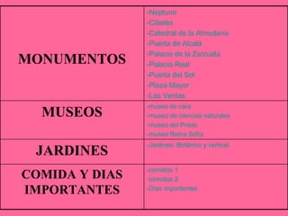 Este documento proporciona información sobre varios aspectos de Madrid, como monumentos, museos, jardines, comidas típicas y días importantes. Describe varias fuentes, como Neptuno y Cibeles, así como monumentos como la Catedral de la Almudena, la Puerta de Alcalá y los palacios reales. También cubre museos como el Museo del Prado, el Museo Reina Sofía y el Museo de Ciencias Naturales. Incluye detalles sobre jardines botánicos y verticales, así como platos tradicional
