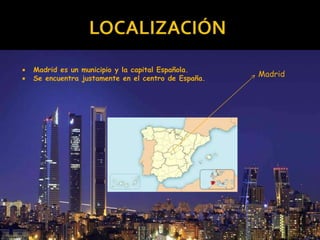 Madrid es la capital de España, ubicada en el centro del país. Algunos de los lugares más importantes de Madrid incluyen el Parque del Retiro, la Puerta de Alcalá y el Palacio Real. Los equipos de fútbol más populares son el Real Madrid y el Atlético de Madrid. Madrid también alberga varios hoteles notables y museos como el Museo del Prado y el Museo Reina Sofía.