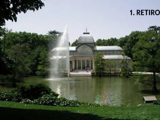 Este documento contiene una lista de 24 lugares y actividades populares en Madrid, España. Algunos de los lugares destacados incluyen el Retiro, la Gran Vía, el Museo del Prado, la Plaza Mayor, y el Templo de Debod. Otras actividades mencionadas son comer calamares en la Plaza Mayor, pasear por la Gran Vía, ir de compras al Rastro, y probar tapas en bares de barrio.