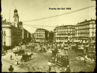 El documento presenta una serie de fotografías antiguas de diferentes lugares de Madrid como la Puerta del Sol, la Gran Vía, la Calle de Alcalá, la Plaza de Cibeles y otros, que muestran cómo eran esos lugares antes de su transformación a inicios del siglo XX. Las fotos proporcionan una visión histórica de la ciudad de Madrid y cómo ha cambiado con el tiempo, mostrando detalles como los tranvías tirados por mulas y la ausencia de algunos edificios emblemáticos actuales.