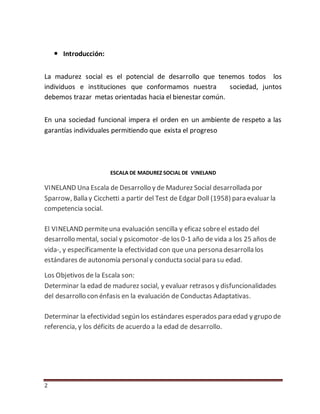 Este documento presenta un taller sobre madurez social. Explica la escala de madurez social de Vineland, la cual mide cuatro áreas: comunicación, habilidades para la vida cotidiana, socialización y habilidades motoras. También discute conceptos como la evolución social y tecnológica, los orígenes de la publicidad, y acciones que pueden tomarse para fomentar una mayor responsabilidad social. El objetivo general es analizar diferentes aspectos relacionados con el desarrollo de la madurez social a nivel individual y de la soc