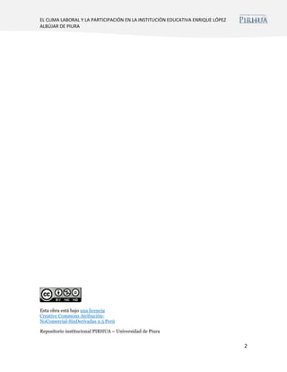 Este documento presenta los resultados de una investigación sobre el clima laboral y la participación en la Institución Educativa Enrique López Albújar de Piura, Perú. La autora realizó una encuesta a docentes para evaluar dimensiones como la comunicación, satisfacción laboral y participación. Los resultados mostraron que el clima laboral es percibido entre regular y bueno por los docentes, aunque existen factores que pueden fortalecerse desde la gestión escolar como el reconocimiento y las oportunidades de participación.
