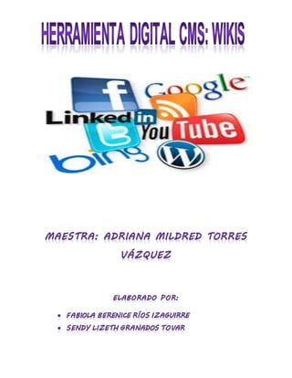 El documento habla sobre el uso de wikis como herramientas educativas. Explica que una wiki es un sitio web colaborativo que permite a múltiples usuarios crear, editar y modificar contenido de forma fácil y rápida. Luego describe varios usos educativos potenciales de las wikis, como crear un aula virtual, desarrollar proyectos colaborativos, publicar trabajos de estudiantes y más. Finalmente, presenta un ejemplo de cómo un maestro podría asignar una tarea de investigación a sus estudiant