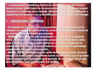 Este documento describe los procesos de comunicación y enseñanza, así como la integración de las nuevas tecnologías en entornos sin recursos tecnológicos. Se define la comunicación como un proceso voluntario entre emisor y receptor, y la enseñanza como la transmisión de conocimientos del profesor al alumno. También se describen los filtros que pueden afectar la comunicación y el aprendizaje, y se propone utilizar herramientas de software libre y metodologías colaborativas para integrar las nuevas te