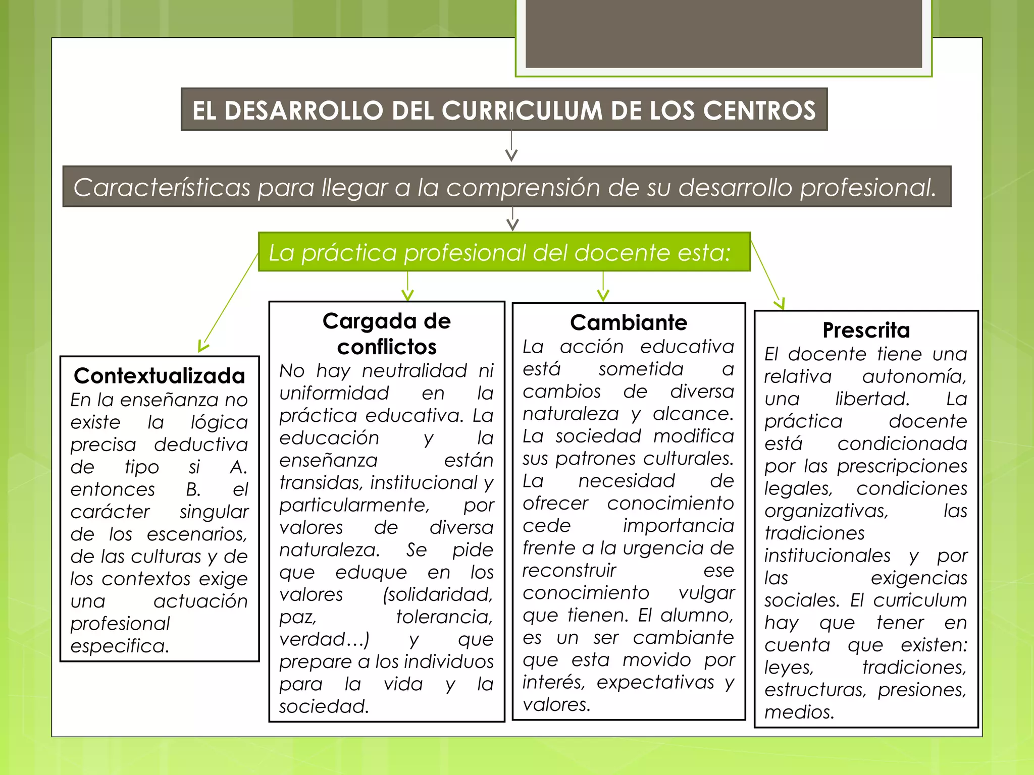 El documento describe las características de la práctica profesional docente: 1) Está contextualizada y requiere una actuación específica para cada escenario y cultura; 2) No es neutral sino que está influenciada por valores diversos; 3) Está sujeta a constantes cambios en la sociedad, los alumnos y las necesidades educativas.
