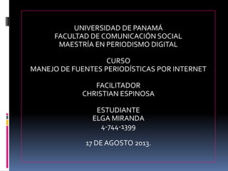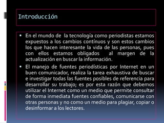 Este documento presenta un resumen de un curso sobre el manejo de fuentes periodísticas por Internet. El curso enseña a los estudiantes cómo buscar información en línea de manera efectiva utilizando palabras clave y evaluando la calidad y fiabilidad de las fuentes. También introduce varias herramientas útiles como Feedly, Delicious y Storify para almacenar y administrar información de las redes sociales. El curso ayuda a los periodistas a aprovechar el potencial del periodismo digital.