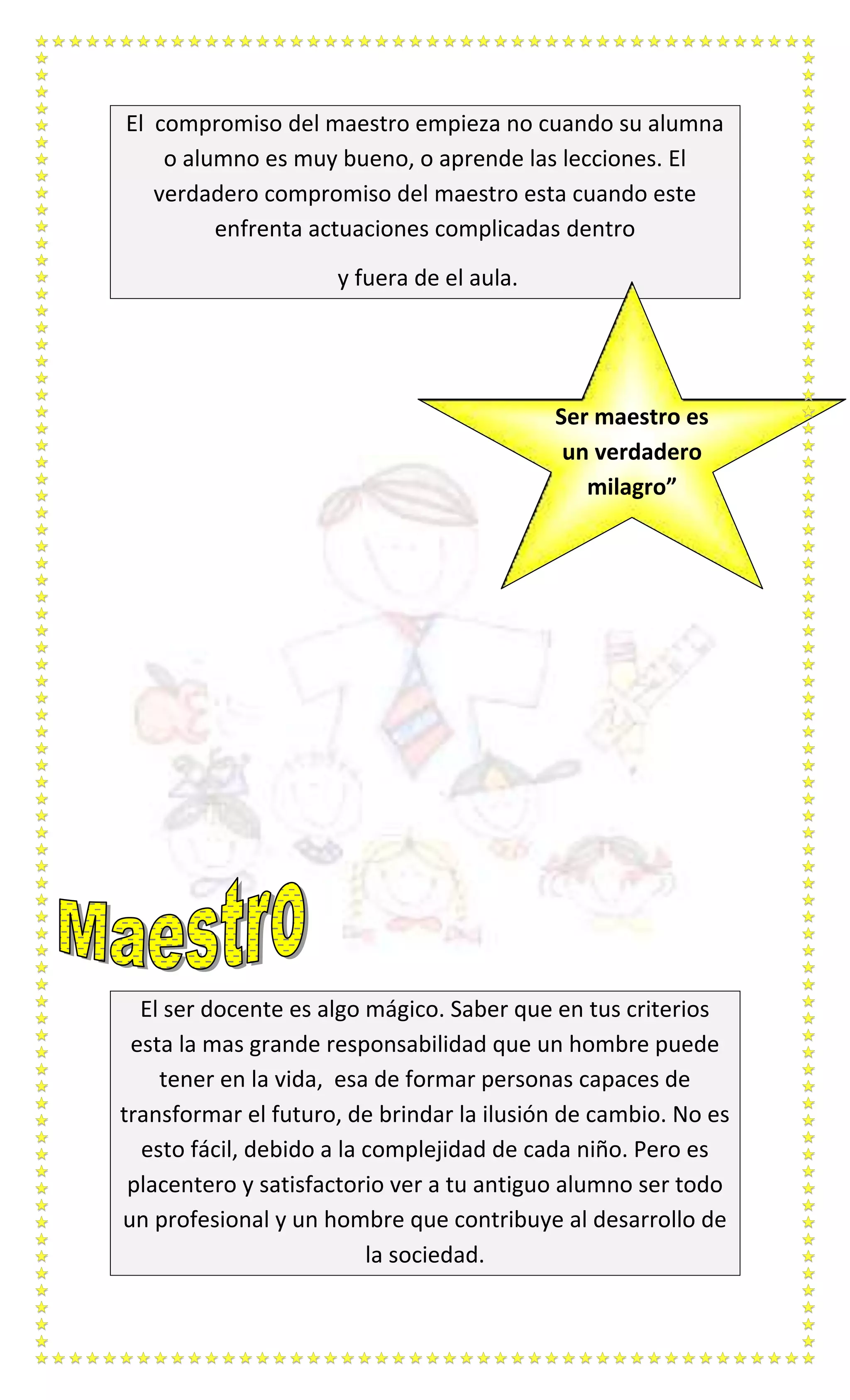 El compromiso verdadero de un maestro no solo se da cuando los estudiantes aprenden fácilmente, sino especialmente cuando enfrentan dificultades dentro y fuera del aula. Ser maestro es una gran responsabilidad y un milagro, ya que los maestros tienen la tarea de formar personas capaces de transformar el futuro y brindar esperanza de cambio a la sociedad. Aunque no es fácil debido a la complejidad de cada estudiante, es gratificante verlos convertirse en profesionales que contribuyen al desarrollo social.