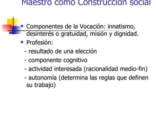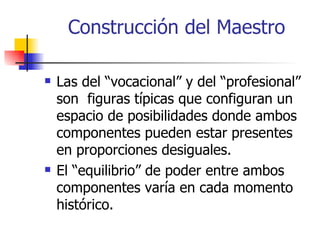 Este documento describe los cambios en el trabajo docente como resultado de transformaciones sociales. Explica cómo la figura del maestro ha evolucionado de una vocación a una profesión más compleja que requiere adaptarse a nuevos contextos organizacionales y desafíos sociales como la masificación escolar y cambios en las familias y relaciones generacionales. También analiza el debate sobre la profesionalización docente entre un enfoque tecnocrático y uno más orgánico.