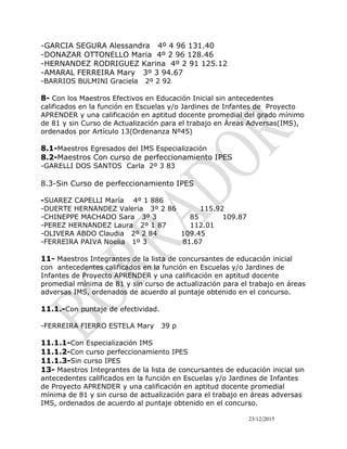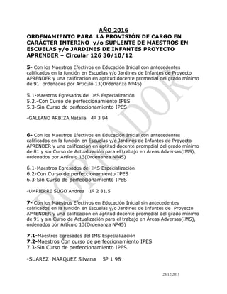 Este documento establece el orden de prelación para proveer cargos interinos y suplentes de maestros en escuelas y jardines de infantes de Proyecto Aprender para el año 2016. Los maestros son ordenados de acuerdo a su calificación en aptitud docente, especializaciones, cursos de capacitación y antigüedad calificada en la función. La lista incluye los nombres y calificaciones de los maestros elegibles para cada categoría de acuerdo al orden de prelación establecido.