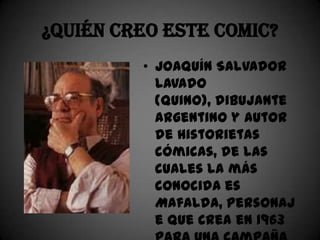 Este documento resume los detalles clave del cómic Mafalda creado por el dibujante argentino Joaquín Salvador Lavado. Describe a los personajes principales como Mafalda, Manolito, Susanita, Felipe, Miguelito y Libertad, así como a los padres y hermano de Mafalda. Explica que la historieta trata sobre una niña precoz que toca temas de actualidad con humor e ironía y que apareció por primera vez en 1964 hasta su última publicación en 1973.