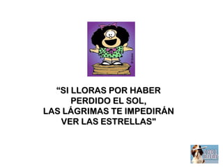 Este documento contiene varias frases célebres de la historieta argentina Mafalda, que critican aspectos sociales y políticos. Algunas frases notables incluyen "Si lloras por haber perdido el sol, las lágrimas te impedirán ver las estrellas", "Trabajar para ganarse la vida está bien... ¿pero por qué esa vida que uno se gana trabajando tiene que desperdiciarse trabajando para ganarse la vida?" y "Amo a la humanidad, lo que me revienta es la gente".