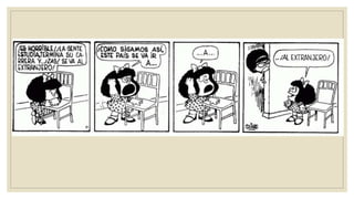 Mafalda, creada por Quino en 1964, surgió inicialmente como parte de una campaña publicitaria y se convirtió en un emblemático personaje de la historieta, conocida por su aguda crítica social y política. La tira describe la vida y problemas de una niña rebelde y su familia, mientras retrata aspectos de la sociedad argentina y global de su época. A lo largo de los años, Mafalda ha mantenido su relevancia cultural y ha sido objeto de culto internacional, trascendiendo su origen como simple caricatura.