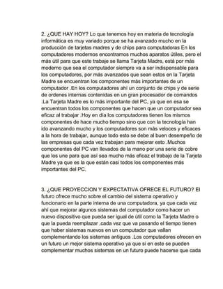 El documento resume la evolución de los computadores desde sus orígenes hasta el futuro. Explica que los componentes clave de los computadores modernos son las tarjetas madres y los chips de procesamiento. En el futuro, se espera que los sistemas operativos y componentes internos mejoren y se desarrollen nuevas tecnologías como computadoras cuánticas, ópticas y basadas en ADN.