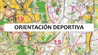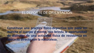 Este documento describe la orientación deportiva. Explica que la orientación es una actividad física al aire libre que implica seguir un recorrido marcado en un mapa pasando por puntos de control. Los corredores usan mapas detallados y brújulas para navegar el terreno y llegar a cada punto de control de forma eficiente. El documento también describe los símbolos empleados en los mapas de orientación y la importancia de la brújula como instrumento de navegación.