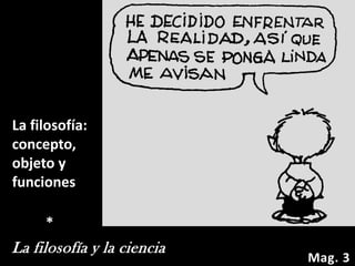 El documento trata sobre la filosofía, describiendo su concepto, objeto y funciones. Explica que la filosofía se ubica entre la religión, el arte y la ciencia, buscando una comprensión de la totalidad de lo real a través de un pensamiento crítico y racional. También analiza las diferencias entre la filosofía y otras formas de conocimiento como la ciencia, la religión y el mito.