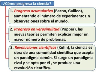 El documento discute tres perspectivas sobre el progreso de la ciencia: 1) progreso acumulativo a través de experimentos y observaciones, 2) progreso en verosimilitud a través de nuevas teorías, y 3) revoluciones científicas impulsadas por nuevos paradigmas. También analiza los peligros potenciales de la ciencia como el cientificismo, la tecnocracia y el poder de autodestrucción, así como la necesidad de una dimensión ética.