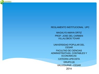 Este documento resume el reglamento institucional de la Universidad Popular del Cesar (UPC). Explica que el reglamento establece las normas, deberes y derechos de los estudiantes y el personal de la universidad. También describe cómo los estudiantes pueden cambiar de programa académico, qué sanciones hay por fraude en un examen, y en qué casos los estudiantes deben usar el reglamento, como cuando se les niega un diferido o una transferencia de materia. El documento concluye explicando la importancia de que los estudiantes conoz