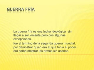La guerra fría fue una lucha ideológica entre el capitalismo y el socialismo después de la Segunda Guerra Mundial. El capitalismo es un sistema económico privado basado en los mercados, mientras que el socialismo defiende un sistema económico controlado por el estado y la búsqueda de igualdad social.