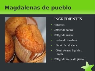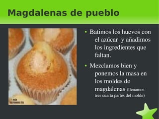 Este documento proporciona una receta para hacer magdalenas de pueblo. La receta incluye ingredientes como huevos, harina, azúcar, levadura, ralladura de limón y nata o leche. Las instrucciones son batir los huevos con el azúcar y añadir los demás ingredientes, mezclar bien y rellenar moldes de magdalenas tres cuartas partes. Hornear a 230 grados durante 15 minutos a 210 grados.