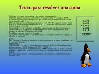 Este documento presenta varios trucos matemáticos, como sumar números de cuatro cifras para obtener un resultado predeterminado, adivinar un número secreto basado en operaciones matemáticas, y juegos con fechas que siempre dan como resultado el número 9. También describe brevemente la historia y propiedades de los cuadrados mágicos, incluidos algunos ejemplos.