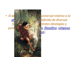 El amor es un concepto universal relativo a la afinidad entre seres, que ha sido definido de diversas formas según las diferentes ideologías y puntos de vista científicos, filosóficos, religiosos y artísticos a lo largo de la historia.