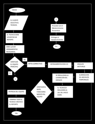 El documento describe los pasos para realizar un mantenimiento preventivo a un equipo. Estos incluyen que el cliente solicite el servicio al técnico, el técnico levante un reporte y verifique la fecha acordada, lleve las herramientas necesarias, realice una desfragmentación del disco duro, análisis antivirus y liberación de espacio, y finalmente verifique el buen funcionamiento del equipo antes de entregárselo al cliente.