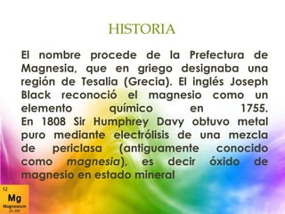 El magnesio es el tercer elemento más abundante en la corteza terrestre. Se utiliza en aleaciones ligeras como el duraluminio y en la industria pirotécnica. En el organismo, el magnesio ayuda a estabilizar el ADN y ARN, facilita la formación del glucógeno y es necesario para la absorción del calcio y la vitamina C. Algunas de sus principales aleaciones son con aluminio, manganeso, circonio y torio.