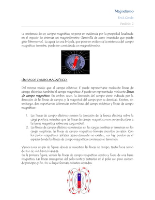 Este documento describe una práctica de laboratorio sobre magnetismo. Se analizan las propiedades de los campos magnéticos y las fuerzas que ejercen sobre objetos cargados. Se grafican las líneas de campo magnético alrededor de imanes y se observa cómo se ven afectados los electrones en un tubo de rayos catódicos por un campo magnético. También se estudia el comportamiento de diferentes materiales en presencia de un campo magnético y cómo se deposita cobre en una cuba electrolítica cuando se aplica tanto un campo el