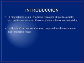 Existen diversos tipos de comportamiento de los materiales magnéticos, siendo los principales: el ferromagnetismo, el diamagnetismo y el paramagnetismo. El documento explica los conceptos básicos del magnetismo como los campos y fuerzas magnéticas, los dipolos magnéticos atómicos y las clasificaciones de los diferentes materiales magnéticos.