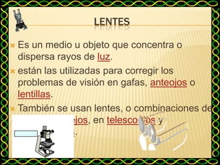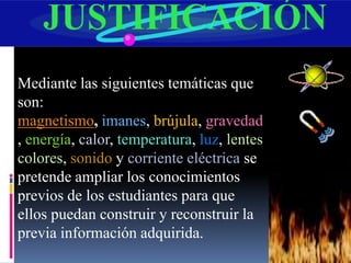 Este documento trata sobre diversos temas de física como el magnetismo, imanes, brújula, gravedad, energía, calor, temperatura, luz, lentes de colores, sonido y corriente eléctrica. Explica estos conceptos detalladamente y describe sus características, propiedades y utilidad en la sociedad con el fin de ampliar los conocimientos de los estudiantes sobre estos temas fundamentales.