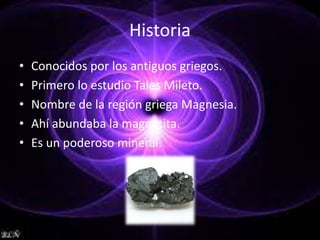 El documento aborda la historia y conceptos básicos del magnetismo, incluyendo su estudio inicial por Tales de Mileto y su conexión con el mineral magnetita. Se describen los tipos de imanes, sus propiedades, y la influencia de los campos magnéticos en materiales como el níquel, hierro y cobalto. Además, se menciona la diferencia entre imanes naturales y artificiales, así como cómo se generan estos últimos.