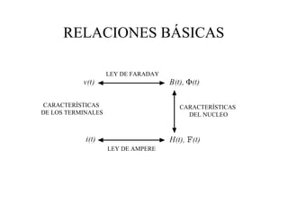 Este documento resume las relaciones básicas entre magnitudes eléctricas y magnéticas, incluyendo las leyes de Faraday, Ampere y Lenz. También describe las características de los materiales magnéticos y modelos de circuitos magnéticos, inductores y transformadores, abordando conceptos como reluctancia, saturación y flujo de fuga.