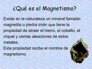El documento habla sobre el magnetismo. Explica que la magnetita es un mineral que atrae el hierro y que esta propiedad se llama magnetismo. Los imanes pueden ser naturales o artificiales y tienen dos polos: norte y sur. Si se acercan polos iguales se atraen y si son distintos se repelen. La Tierra se comporta como un enorme imán con polos magnéticos que no coinciden con los geográficos. La brújula usa una aguja magnética para indicar direcciones y los imanes tienen usos como adornos, pu