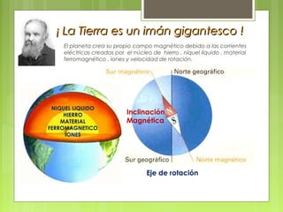 El documento describe el campo magnético terrestre. La Tierra genera su propio campo magnético debido a las corrientes eléctricas en su núcleo líquido de hierro y níquel, lo que crea polos norte y sur magnéticos. El campo magnético protege la Tierra de las partículas cargadas del sol y afecta procesos biológicos como la migración animal y el crecimiento de microorganismos.