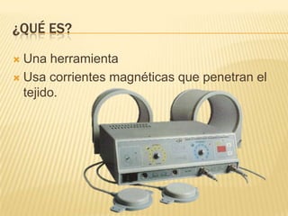 La magnetoterapia utiliza corrientes magnéticas para tratar diversos problemas de salud, funcionando a niveles bioquímicos, celulares y sistémicos. Presenta ventajas como analgesia, disminución de edemas y efectos antiinflamatorios, pero también puede causar efectos secundarios como eritema y lipotimia en pacientes con ciertas condiciones. Su uso debe estar supervisado por un profesional para maximizar beneficios y minimizar riesgos.