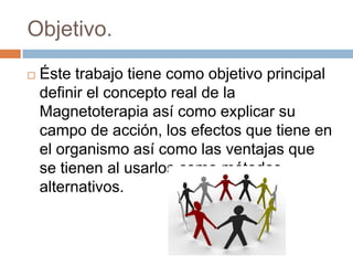 La magnetoterapia es una terapia alternativa que utiliza campos electromagnéticos de bajo impulso para tratar diversas patologías, afectando a nivel celular y molecular. Tiene efectos positivos como analgesia, vasodilatación y relajación muscular, aunque se debe tener precaución en pacientes con ciertas condiciones. Destaca por ser una terapia no invasiva y de fácil aplicación, recomendada por su accesibilidad y efectividad.