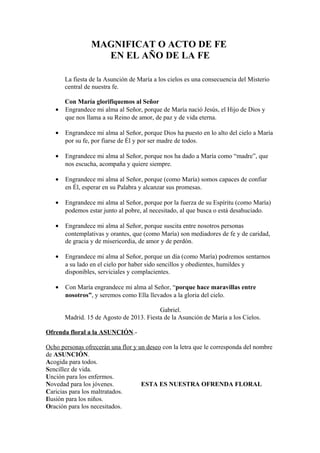 El documento habla sobre la fiesta de la Asunción de María a los cielos y cómo siguió el ejemplo de fe de María. Alaba a María por su fe en Dios y por ser la madre de Jesús y de todos los creyentes. También describe cómo María nos guía a confiar en Dios, estar con los necesitados, y un día sentarnos a su lado en el cielo si somos obedientes y humildes como ella. El documento concluye con una ofrenda floral en la que ocho personas ofrecerán una flor y un deseo correspondiente a cada letra del