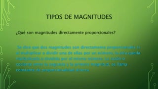 Este documento define y explica diferentes tipos de relaciones entre magnitudes. Define magnitudes directamente proporcionales como aquellas donde si una magnitud se multiplica o divide por un número, la otra magnitud también se multiplica o divide por el mismo número. También define magnitudes directamente correlacionadas como aquellas donde si una aumenta la otra también aumenta. Finalmente, define magnitudes inversamente proporcionales como aquellas donde si una se multiplica o divide, la otra se divide o multiplica por el mismo número.