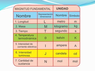 El documento aborda las magnitudes físicas y su clasificación en fundamentales, derivadas y auxiliares, además de su medición utilizando instrumentos específicos. Se establece el Sistema Internacional de Unidades (SI) y sus unidades de base y derivadas, junto con la notación científica para expresar números grandes y pequeños. También se explican las dimensiones físicas, su uso en ecuaciones y la importancia del principio de homogeneidad.