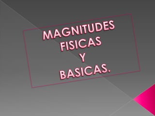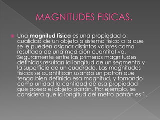 El documento describe las magnitudes físicas y básicas. Define una magnitud física como una propiedad o cualidad de un objeto o sistema físico que puede medirse cuantitativamente. Existen magnitudes básicas como la longitud, masa, tiempo y corriente eléctrica, y sus unidades son el metro, kilogramo, segundo y amperio respectivamente. Estas cuatro magnitudes son las unidades fundamentales del sistema métrico utilizado en física.