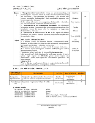 Este documento presenta la planificación de una sesión de aprendizaje sobre magnitudes físicas fundamentales y derivadas en un quinto año de secundaria. La sesión incluye actividades como mediciones de magnitudes, comparación de resultados y reflexión sobre los aprendizajes. El objetivo es que los estudiantes comparen los tipos de magnitudes a través de experiencias sencillas y valoren los aprendizajes del área.
